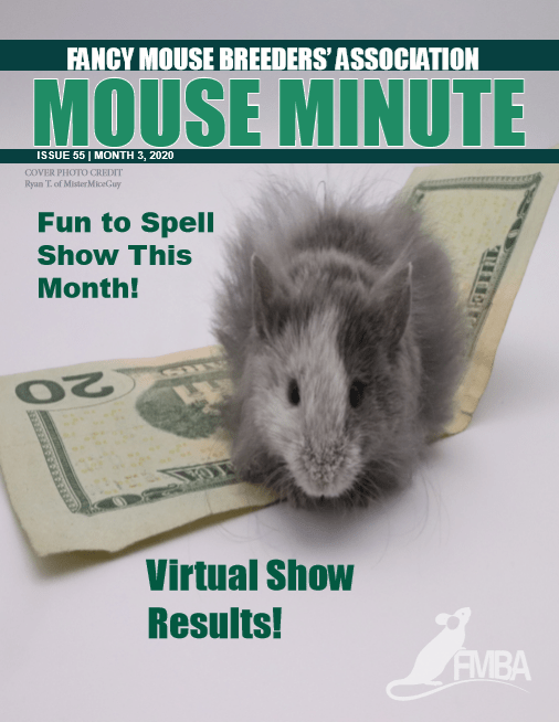 MisterMiceGuy has won best in show at FMBA’s 2019 virtual show. The win was announced in the March Mouse Minute magazine Issue 55. The winner was featured on the cover of the magazine and is shown above. This is a Under 8 week (U8) old male Blue Merle Texel owned by MisterMiceGuy. In addition to being Best in Show, this mouse placed first in the U8 coated category. MisterMiceGuy also one second place in the U8 Coated category with a beautiful Silver Roan Texel Doe.